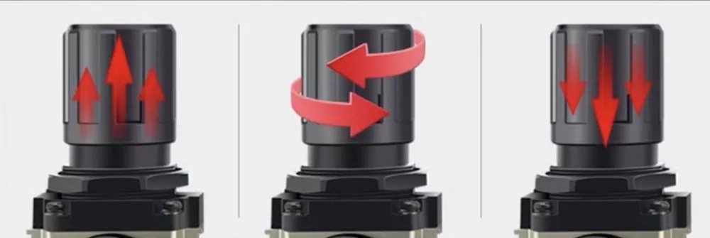 Det er en trykkskala på justeringshetten. Når luft tilføres, trekk opp knappen og vri den med klokken mot "+"-tegnet for å øke trykket. Etter justering, trykk knappen ned for å låse den.