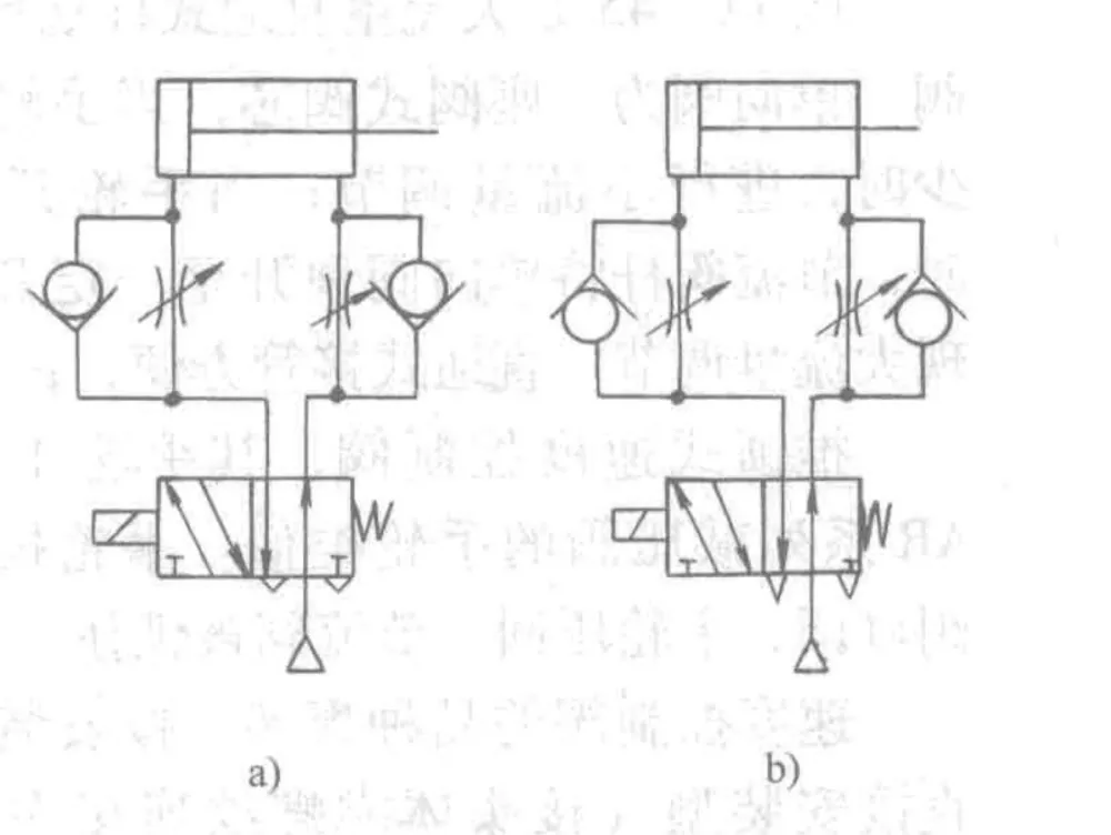 · I (b) (inntaksregulering) er tilbakeslagsventilen på innløpssiden stengt og tilbakeslagsventilen på eksossiden er åpen. Innløpsluftstrømmen er liten, så trykket i innløpskammeret stiger sakte, mens avtrekkskammertrykket synker raskt. Stempelet beveger seg hovedsakelig ved luftekspansjon, noe som gjør hastighetskontrollen ustabil. Denne metoden brukes vanligvis bare for enkeltvirkende sylindre, klemsylindere eller lavfriksjonssylindre.