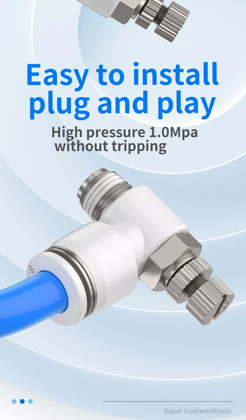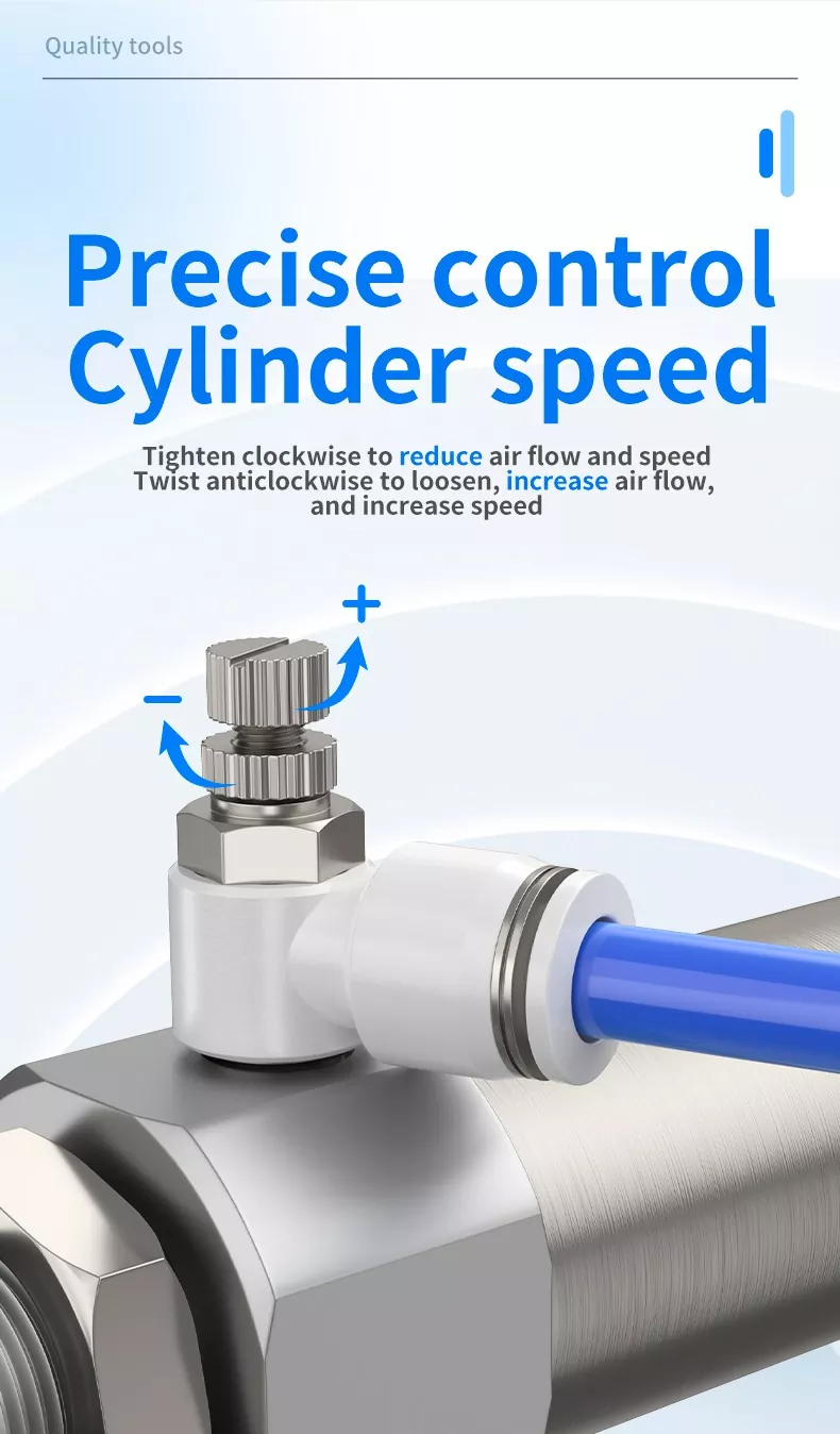 Tilgjengelig i både innløps- og eksos-strupende typer, kan SL-ventiler monteres direkte på sylindere for å sparebeslag, rør, og installasjonstid. Den svingbare designen tillater fleksibel rørorientering, og justeringshjulet med låsemekanisme sikrer fin og stabil strømningskontroll.