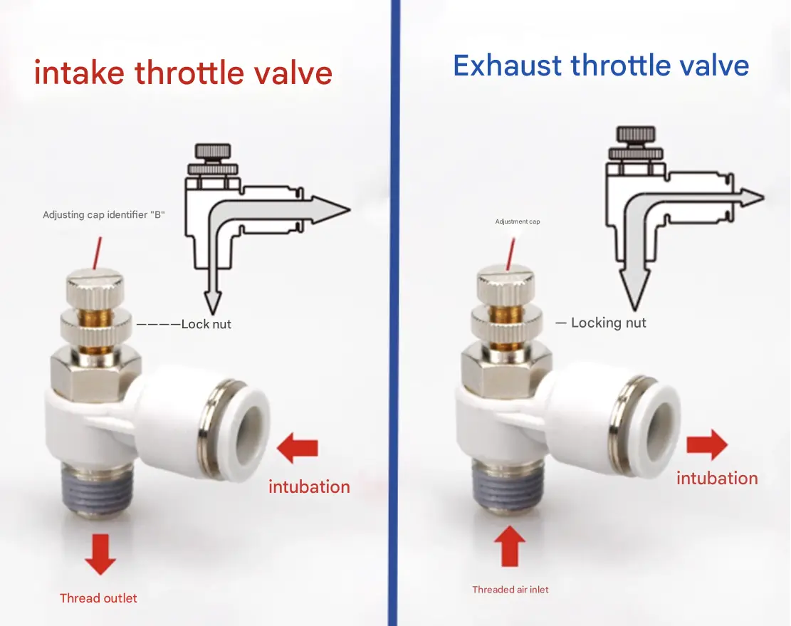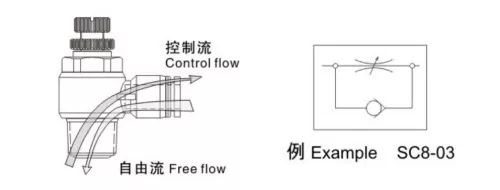 Fra funksjonssymbolene kan vi se at både eksos- og innløpsstrømreguleringsventiler er enveis strupeventiler, som kontrollerer strømningen i bare én retning samtidig som den tillater omvendt luftstrøm å passere fritt. For dobbeltvirkende sylindere foretrekkes eksosgassventiler for å forbedre sylinderbevegelsesstabiliteten. For enkeltvirkende sylindere, som vanligvis bruker en fjær for forlengelse eller tilbaketrekking når det ikke er lufttilførsel, må gassen overvinne fjærkraften under drift, så innløpsgassventiler er egnet for hastighetsregulering.