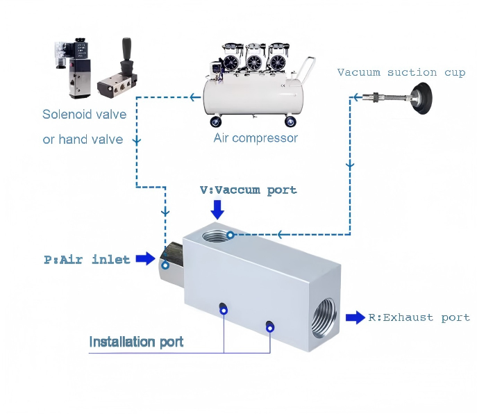 vakuumpumper og vakuumgeneratorer. En vakuumpumpe er en mekanisk enhet som skaper et undertrykk ved sugeporten og lar eksosporten passere direkte gjennom atmosfæren, med et høyt trykkforhold i begge ender for å trekke ut gass. En vakuumgenerator er en pneumatisk komponent som utnytter strømmen av komprimert luft til å danne en viss grad av vakuum. Sammenlignet med en vakuumpumpe har den en enkel struktur, lite volum, lett vekt, lav pris, praktisk installasjon, enkel blanding med støttekomponenter, rask generering og frigjøring av vakuum, og er egnet for intermitterende arbeid med lav strømningshastighet, egnet for spredt bruk