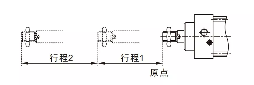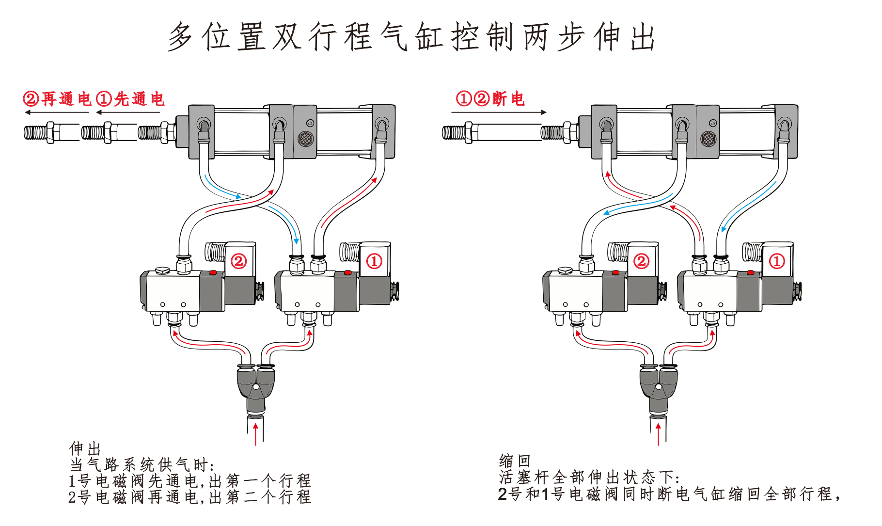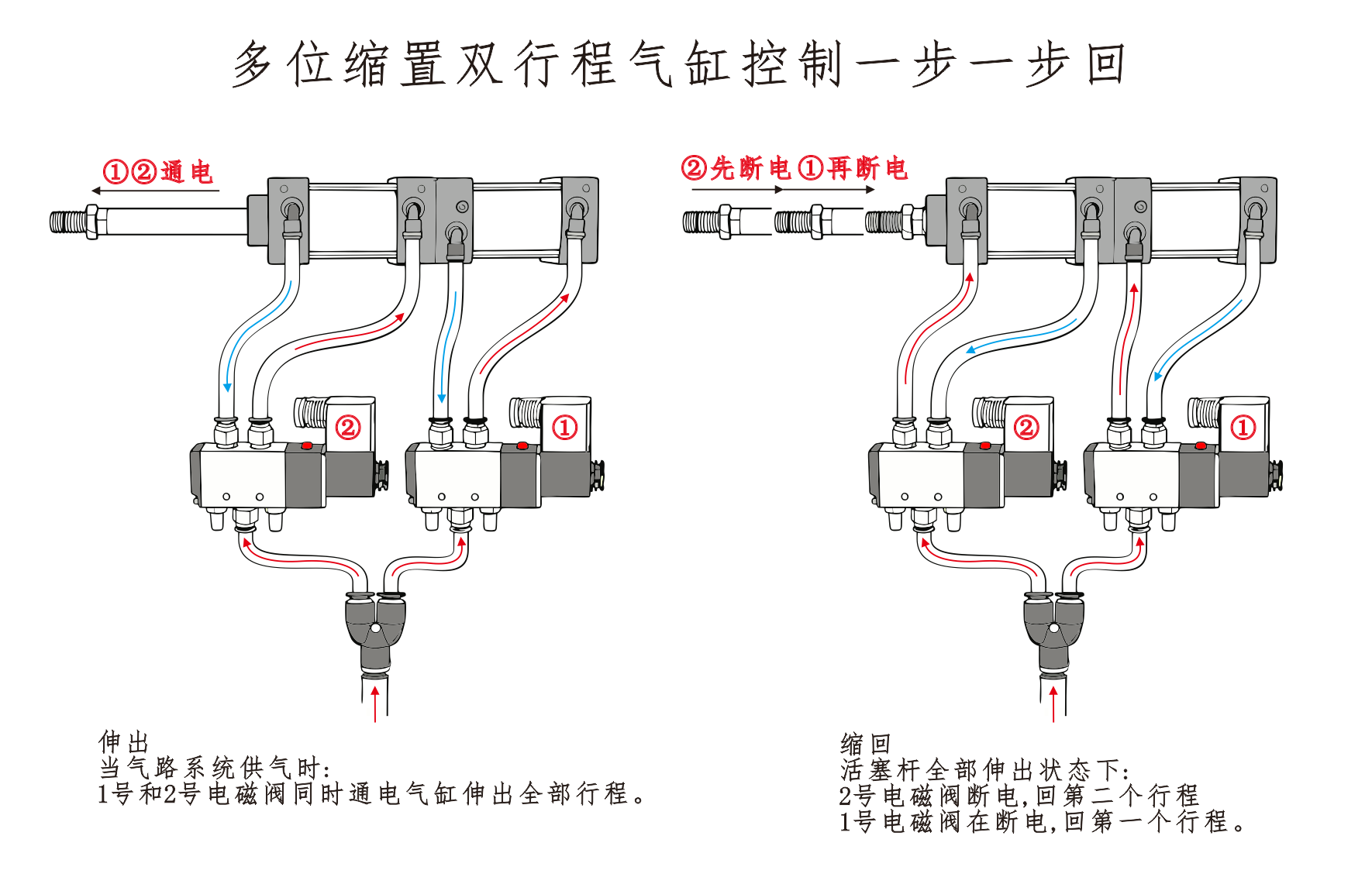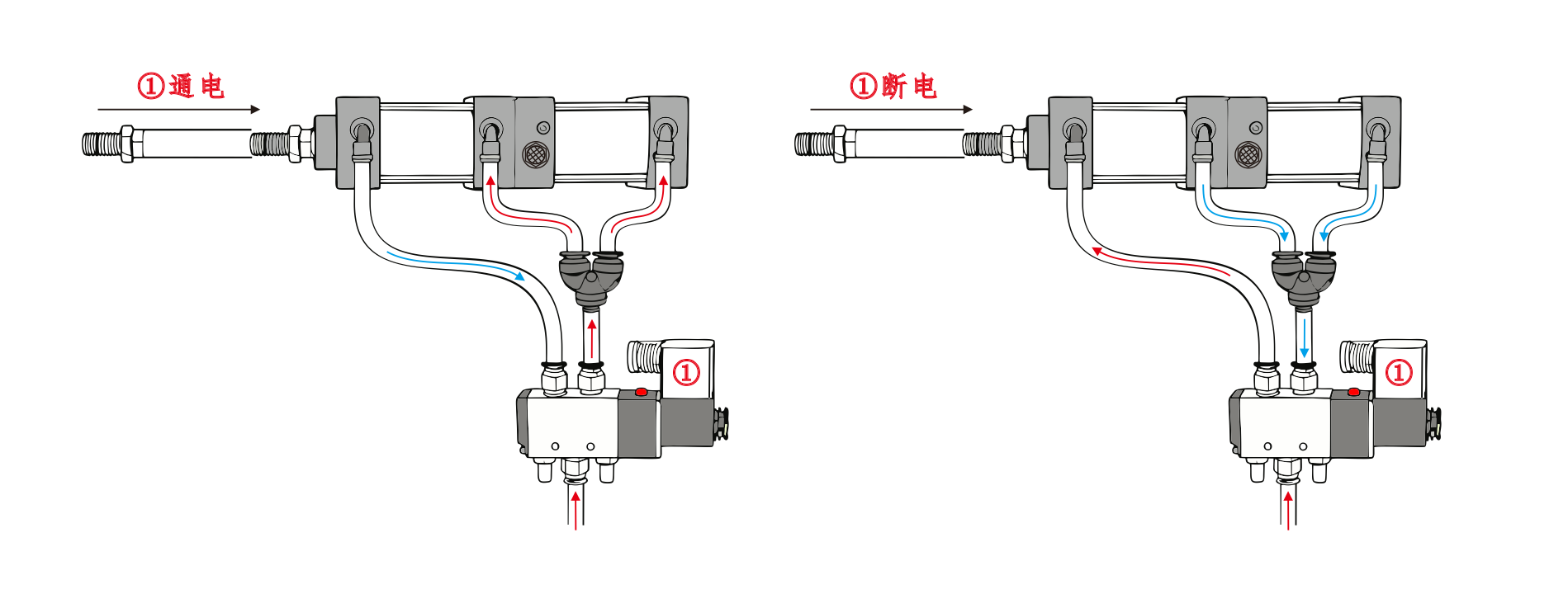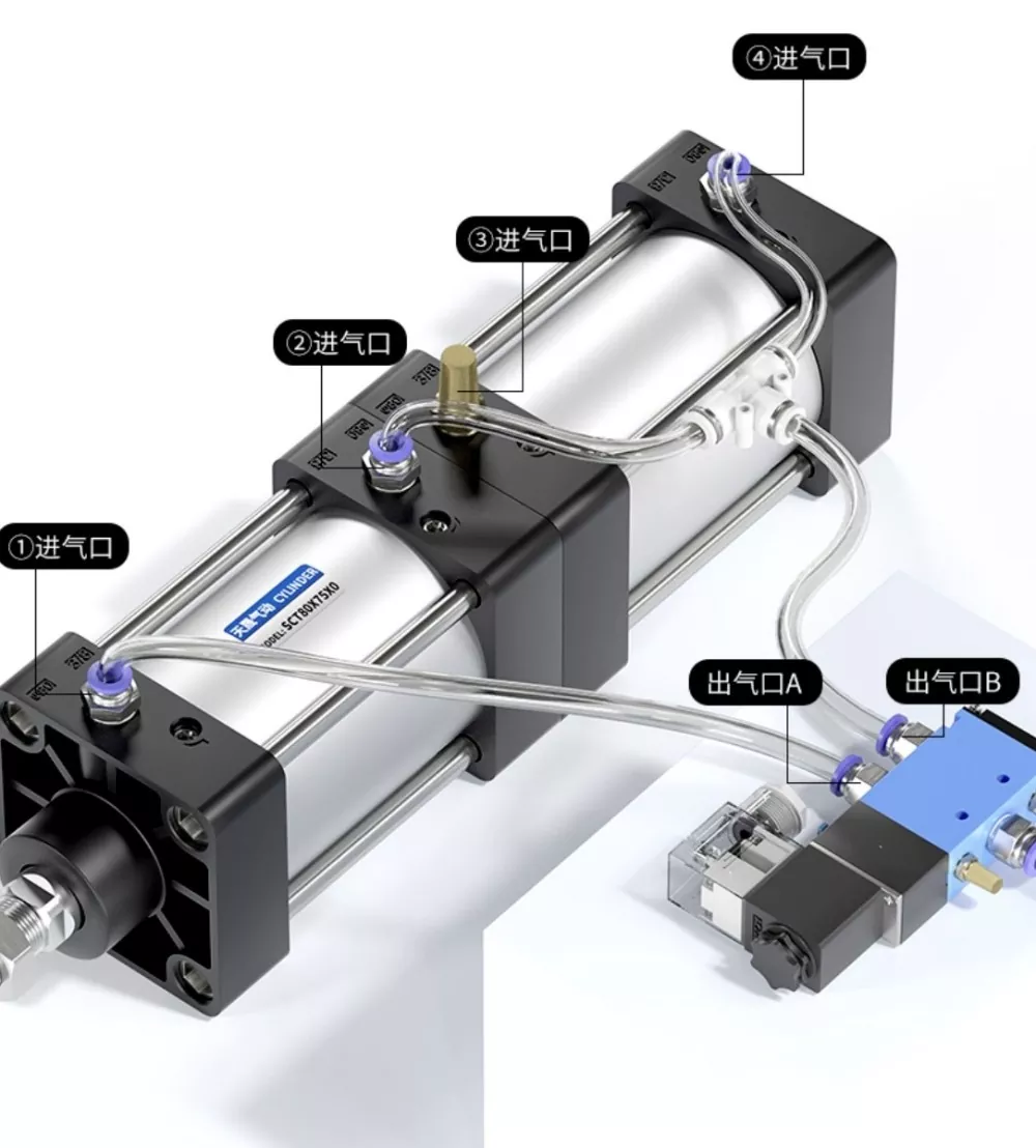 Luftinntaket på sylinderen①er koblet til port A på magnetventilen, og luftinntaket på sylinderen④er koblet i serie til port B på magnetventilen. Luftinntaket til Sylinder③ er koblet til en lyddemper. Når port A på magnetventilen aktiveres, forblir sylindrene i tilbaketrukket posisjon. Når port B er aktivert, begynner sylindrene å fungere.