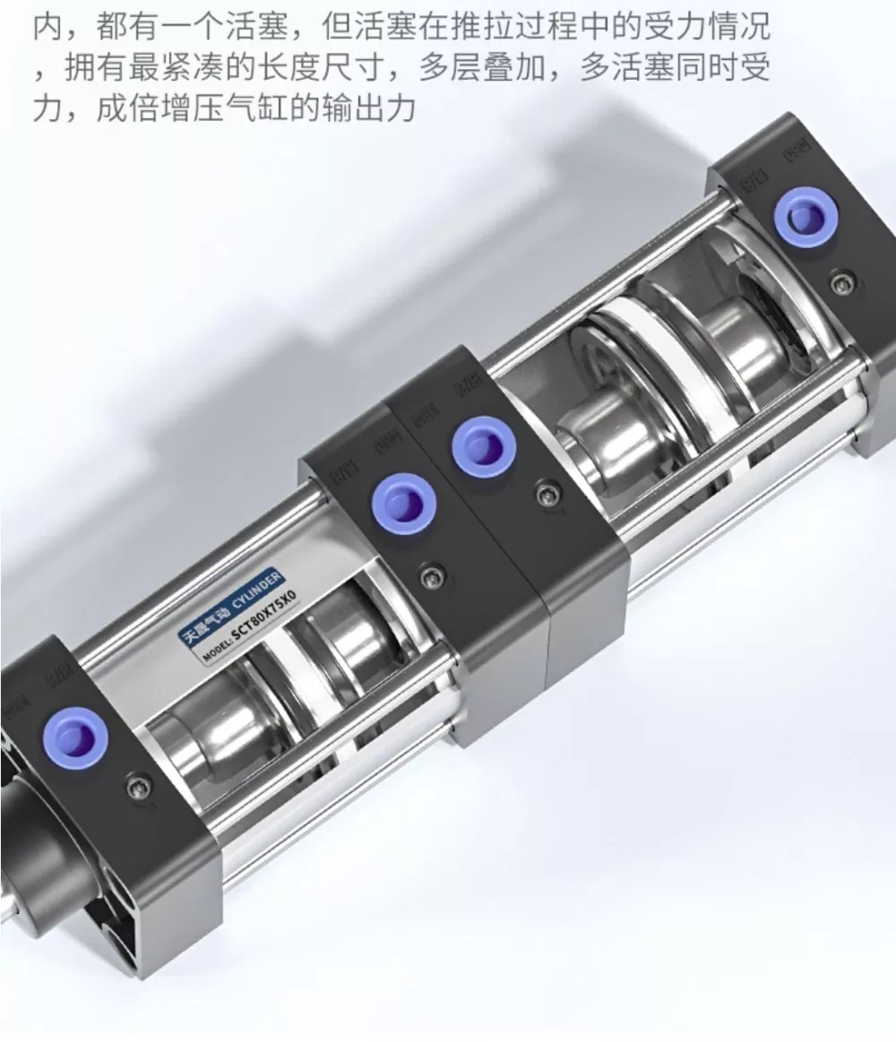 SCT-stagsylinderen har toveis YCC-tetningsringer og en kraftig dobbelttaktsdesign, med et kompakt og raffinert utseende som sikrer rask handling og jevn, stabil utgang. Hvert lag av sylinderen inneholder et individuelt stempel, og under push-pull-prosessen deler flere stempler belastningen, slik at sylinderen kan oppnå den mest kompakte lengden samtidig som den genererer multiplisert utgangskraft gjennom sin flerlags stablede struktur. Denne doble kraftdesignen gir sterkere kraft, og konfigurasjonen med seks tetningsringer gir utmerket tetningsytelse, slik at sylinderen kan holde trykk på opptil 1,4 MPa uten lekkasje.