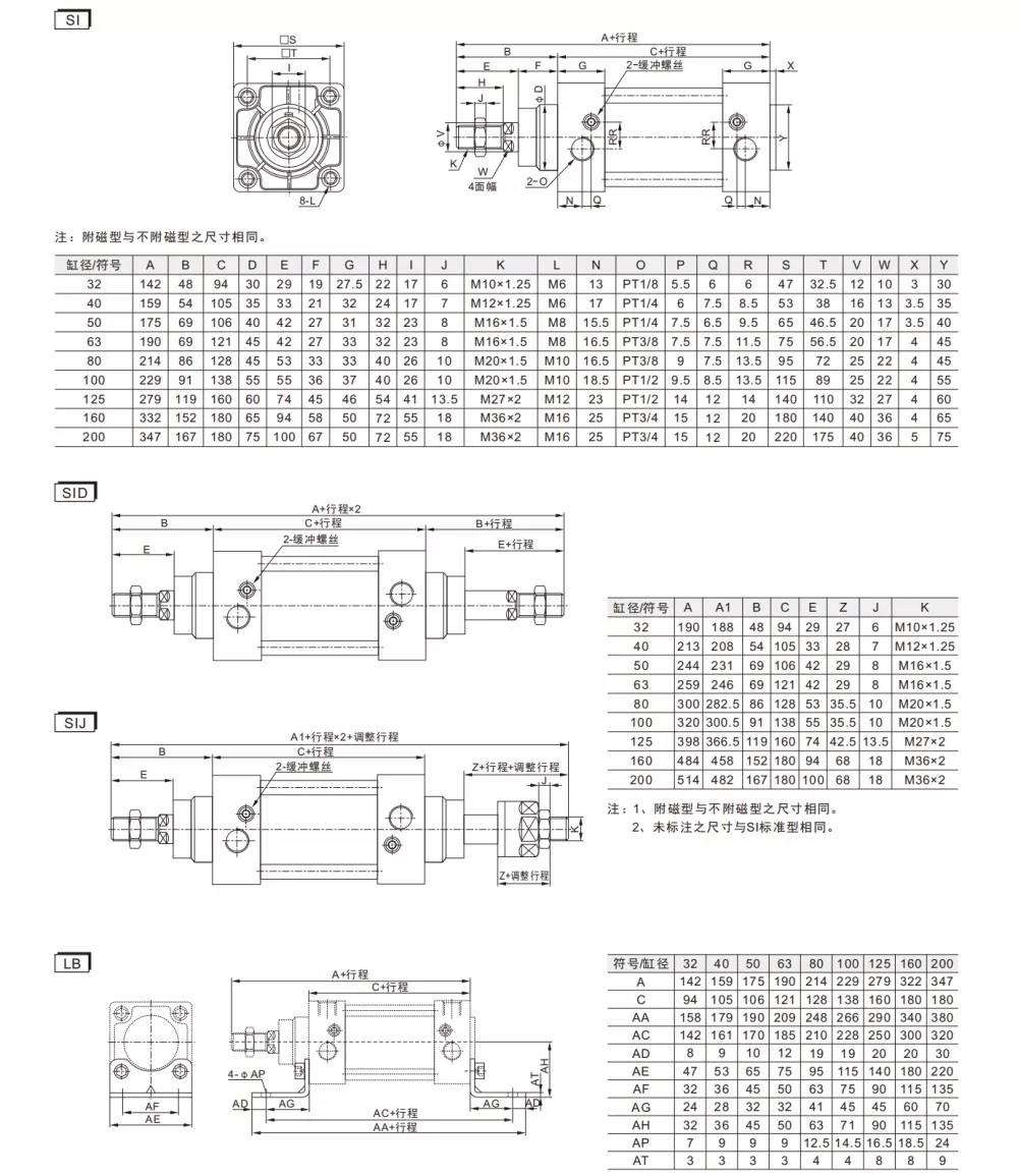 SI-serien ISO15552 standard pneumatisk sylinder er tilgjengelig i tre typer: standard dobbeltvirkende, SID dobbelt stang dobbeltvirkende og SIJ dobbelt stang dobbeltvirkende med justerbart slag. De er i samsvar med ISO 15552-standarden, noe som betyr at installasjonsdimensjonene deres er større ennSU pneumatiske sylindreav samme størrelse. Fast tilbehør kan ikke byttes ut og er kun kompatibelt med ISO 15552 (tidligere ISO 6431) spesifikasjoner.