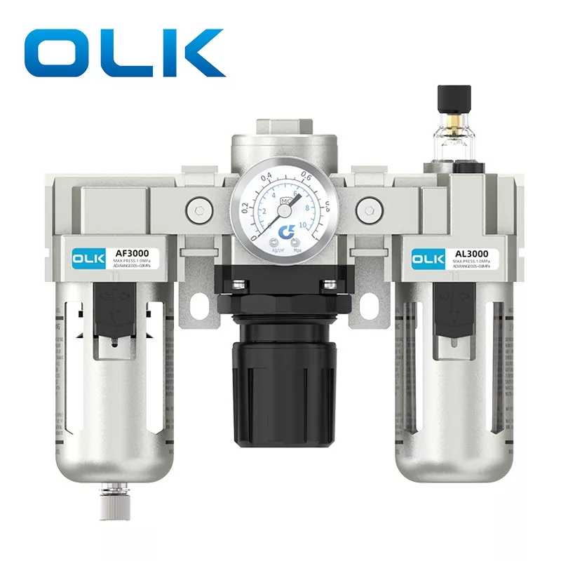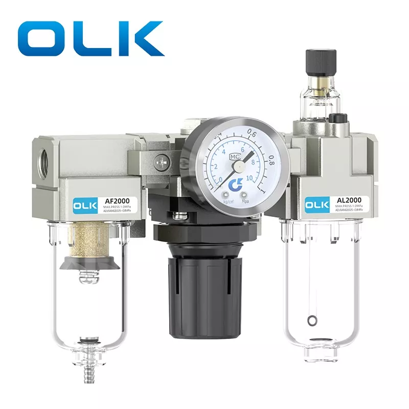 SMC Type AC FRL Unit (Filter-Regulator-Lubricator) er en pneumatisk grunnleggende komponent som integrerer luftkildefiltrering, trykkreduksjon og regulering, og smørebehandling. Den gir ren, stabil og smurt trykkluft for pneumatiske systemer, og forlenger dermed levetiden til pneumatiske komponenter og forbedrer systemets stabilitet. OLK AC Series FRL-enheten fungerer som den essensielle "vokteren" for moderne pneumatiske systemer.